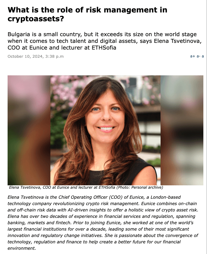 In an exclusive interview with Economy.bg, Elena Tzvetinova, COO of Eunice, discusses the growing importance of risk management in the crypto industry. She highlights key threats, including market manipulation, centralization risks, and regulatory uncertainty, and explains how Eunice’s solutions help crypto firms manage these risks efficiently.